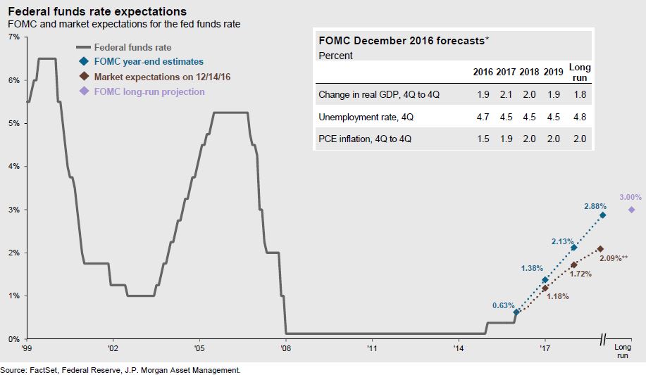 As expected, the U.S. Federal Reserve raised its benchmark interest rate by 0.25 of a percentage point at the conclusion if its two-day meeting in mid-December, the Fed’s first rate hike in a year. Before that, the last rate hike was in 2007. The meeting’s only real surprise was the Fed’s change in its forecast for the number of rate hikes it expects to make in 2017, from two up to three. The hike weighed on capital markets around the world. U.S. bond prices fell initially but stabilized later in the month. The U.S. dollar surged on the news, while the Euro, the Yuan and gold all tumbled.